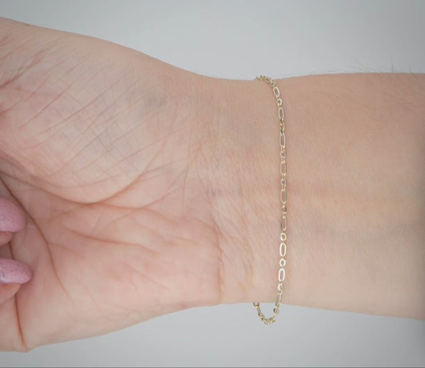 Meaning: A dainty Figaro chain in yellow and white gold, symbolizing the harmony of opposites—the meeting of day and night, light and shadow. It reflects transition, balance, and the beauty found in in-between moments.
